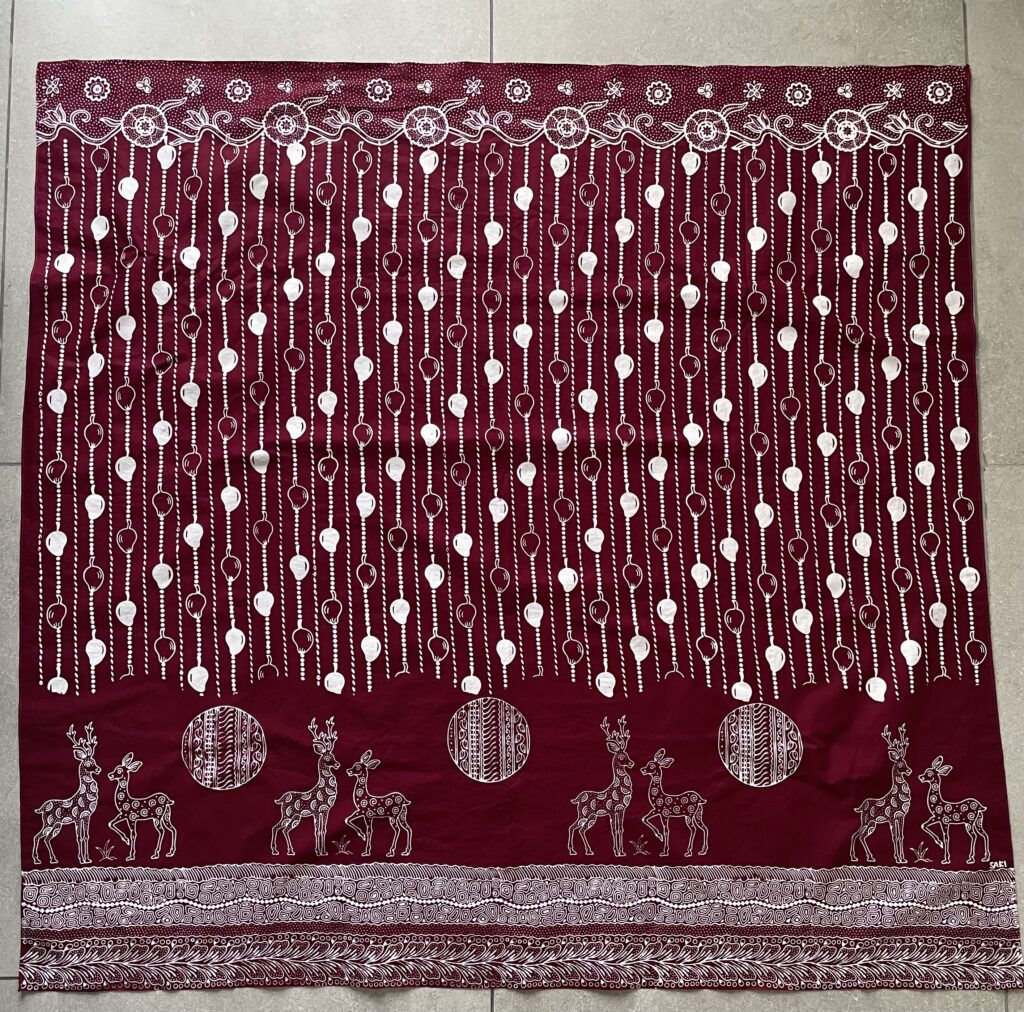 バティックとは、インドネシアの伝統的な布です。ロウを使って布に模様を描き、染色をします。