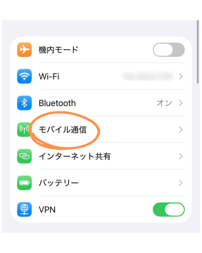 まずは設定の「モバイル通信」をタップ。